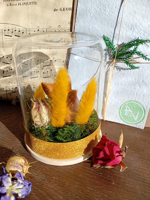 Ce bel animal équestre de nos rêves et espoirs à été délicatement placer dans un petit monde de fleurs séchées.